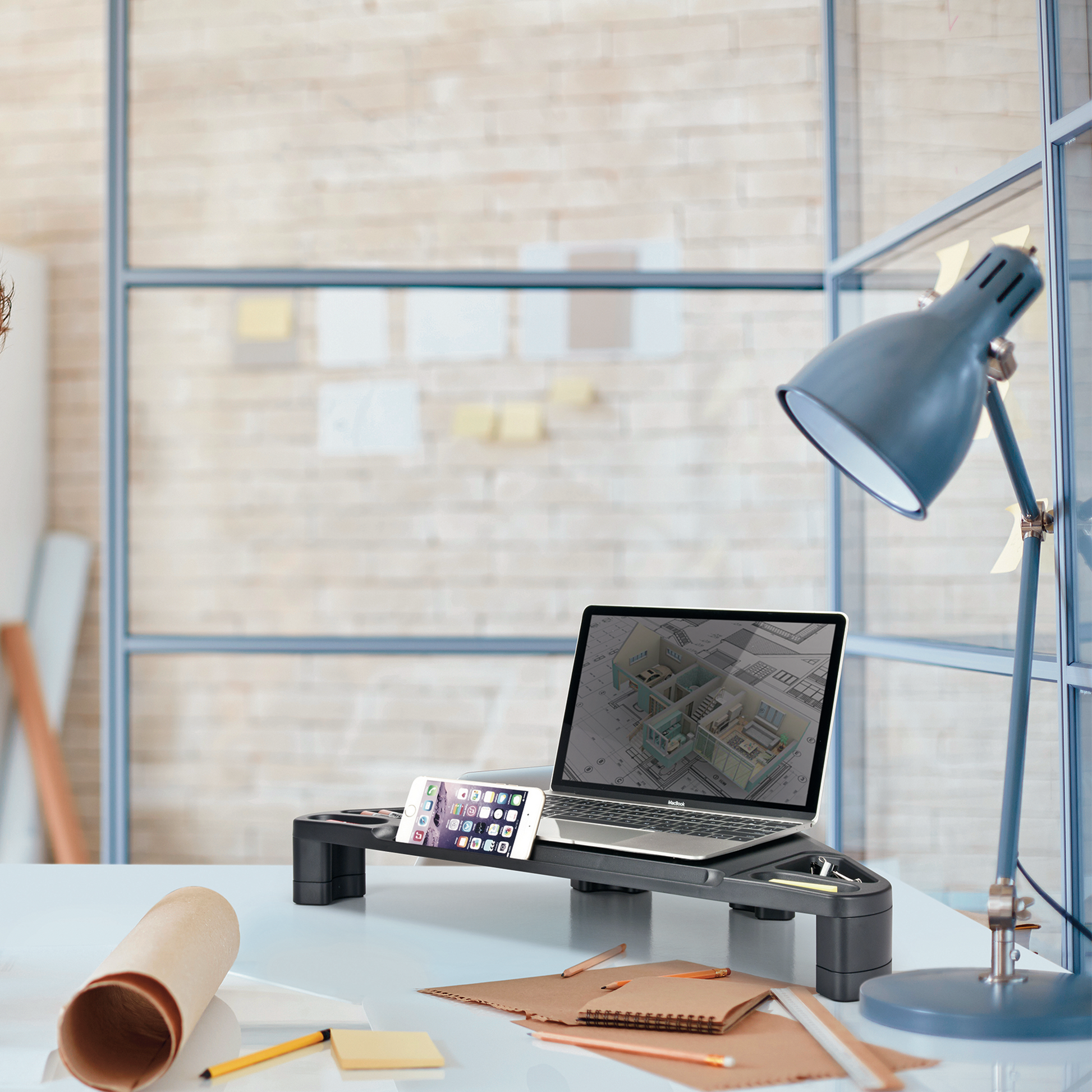 Incorpora un sistema de columnas apilables que permite ajustar la altura del monitor según las necesidades del usuario. Además, ofrece espacios de almacenamiento integrados, incluyendo ranuras frontales para tablets y smartphones, compartimentos para artículos de escritorio y un espacio inferior para guardar el teclado cuando no está en uso.
