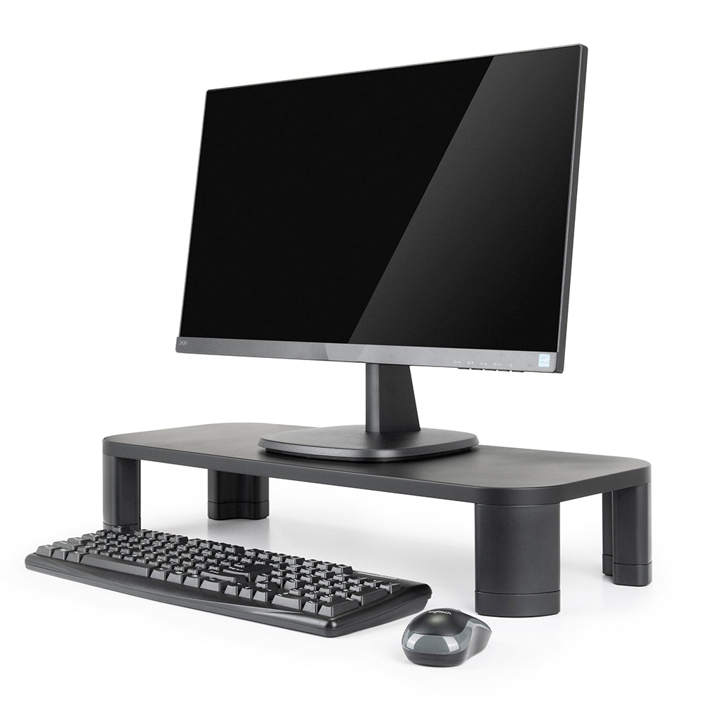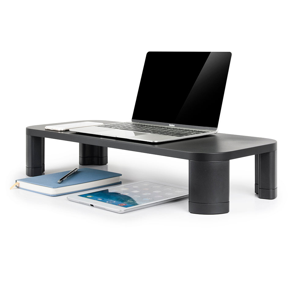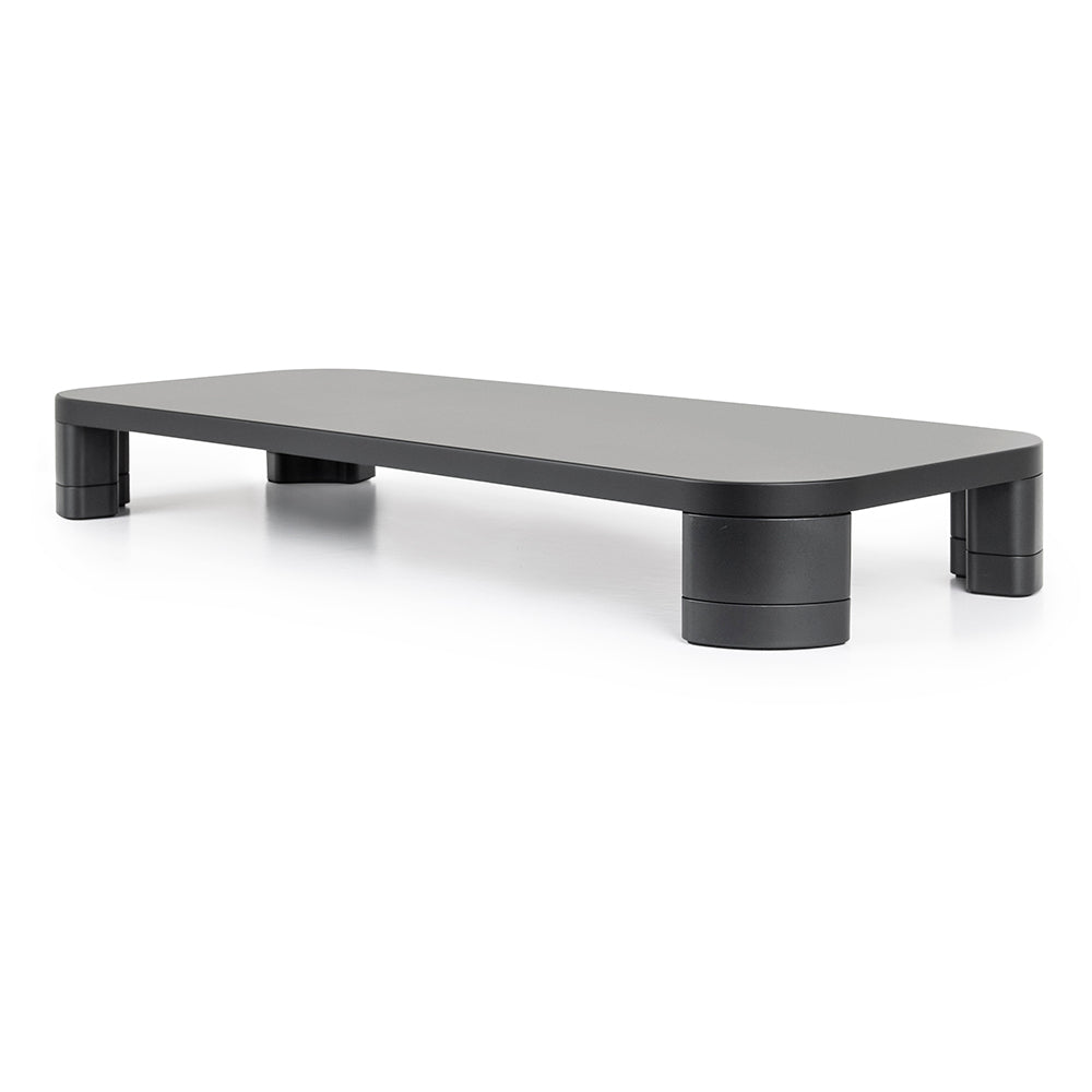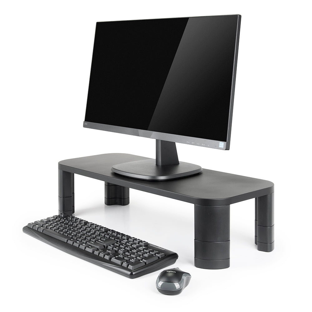Gracias a su estructura resistente, soporta equipos de hasta 10 kg (22 lb). Incorpora un sistema de columnas apilables que permite ajustar la altura según las necesidades del usuario. Además, ofrece un amplio espacio libre bajo la plataforma, ideal para organizar el teclado, documentos u otros accesorios.